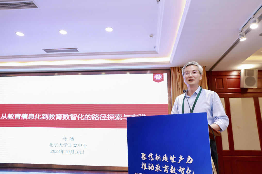 北京大学计算中心主任马皓作“从教育信息化到教育数智化的路径探索与实践”特邀学术报告。他介绍了北京大学计算中心近年来的工作实践,以WiFi-5G校园融合、IdeaLab学科交叉平台、算力平台建设拓展以及“小北学长”智能问答等实际案例,分享推进教育数智化的有效路径。
